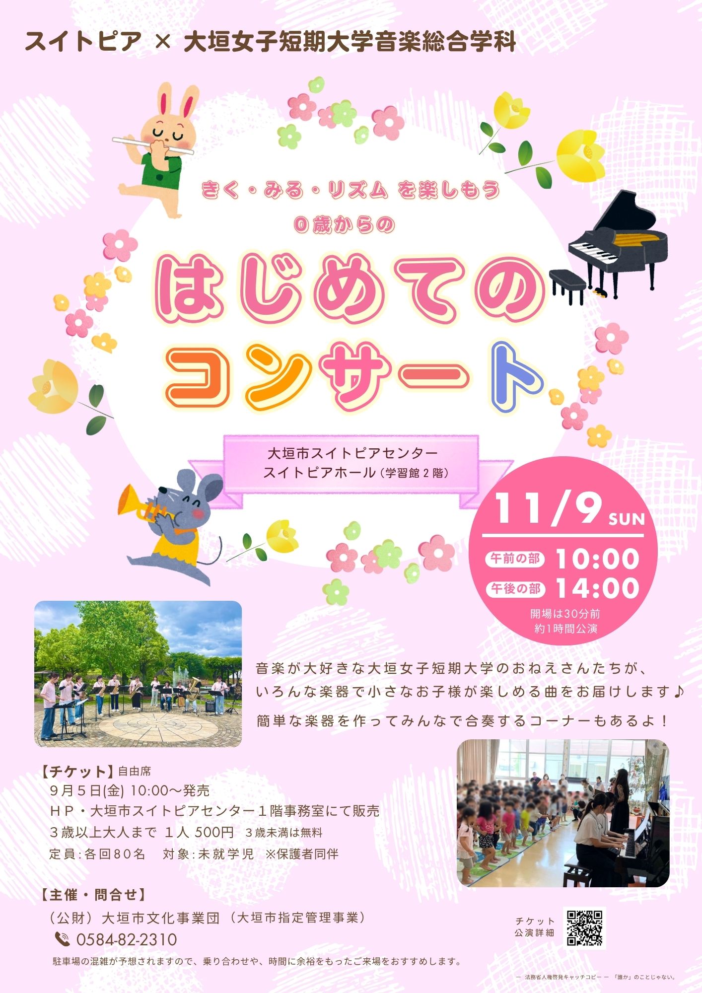プロの演奏家や音楽講師を目指す、大垣女子短期大学音楽総合学科の学生による未就学児対象のコンサート。ピアノや電子オルガン、管楽器などで、小さなお子様が楽しめる曲を演奏します。